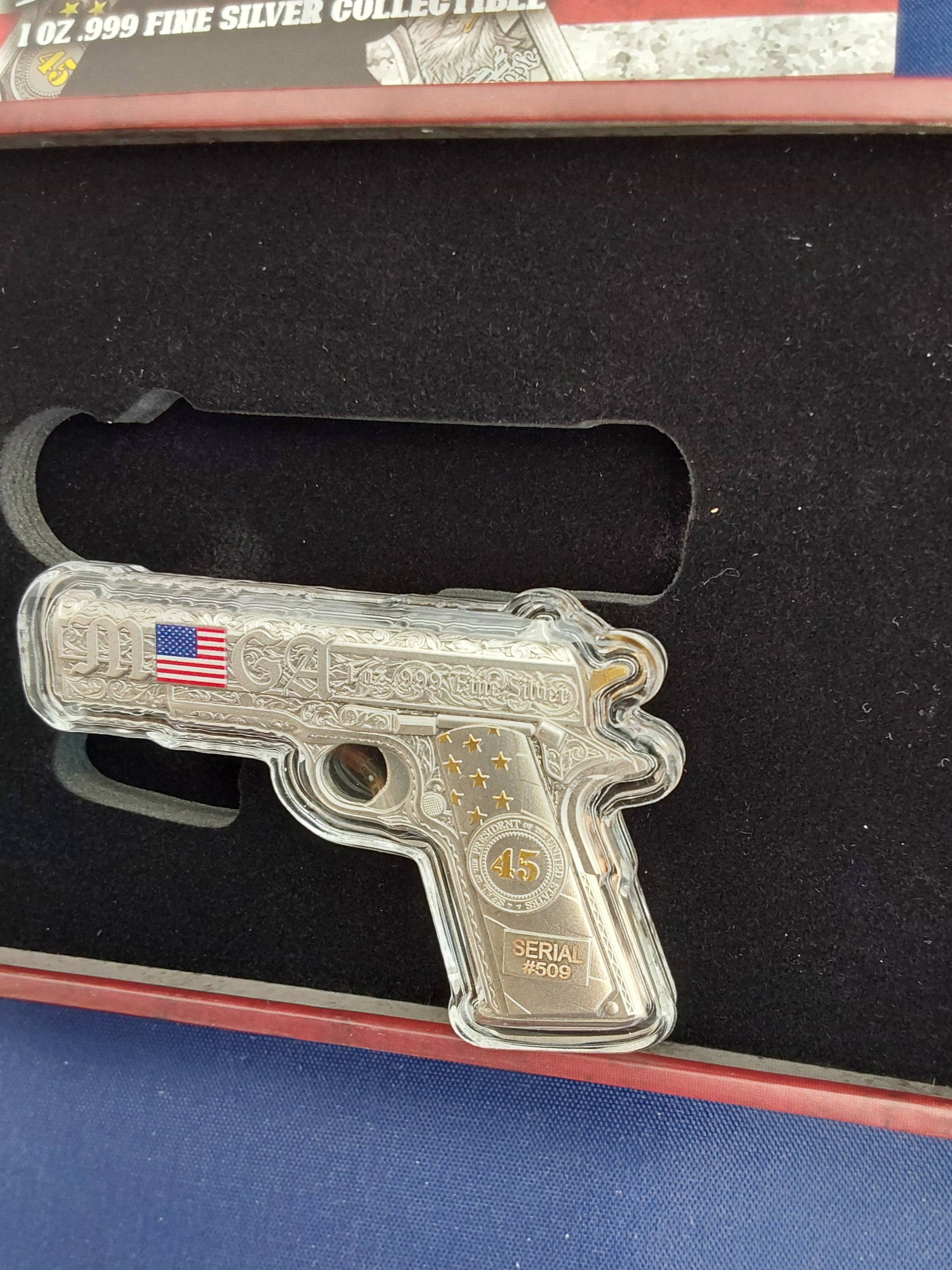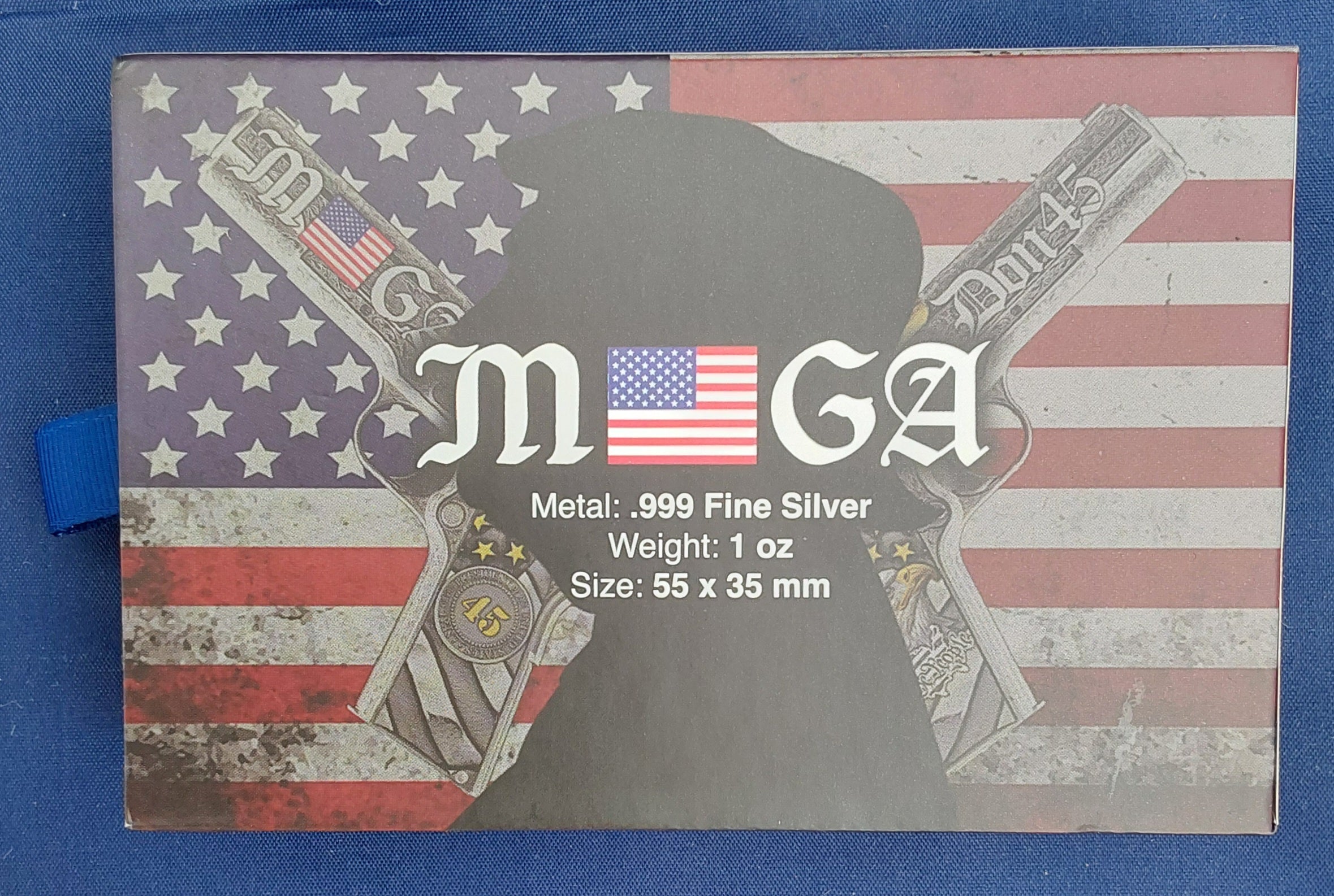 Offered here is The Don 45 – 1 oz .999 Fine Silver Collectible, uniquely minted in the shape of a pistol and presented in a custom patriotic box. This bold and politically themed silver piece celebrates Donald Trump as the 45th President, blending modern collectible, detailed and intricate design with .999 pure silver bullion.