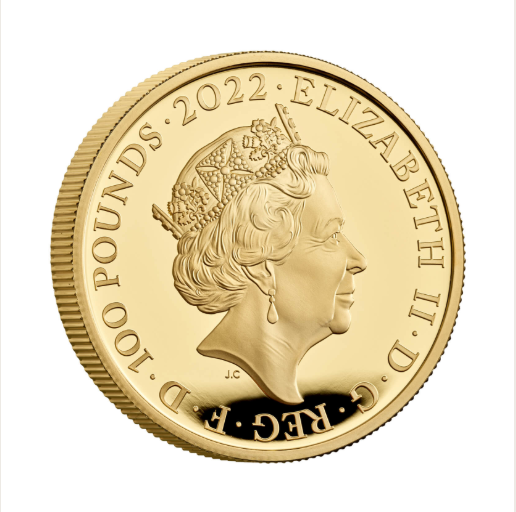 The collection begins with the first Tudor monarch, Henry VII (ruled 1485 to 1509). He won his crown at the Battle of Bosworth Field and ushered in a period of stability after decades of civil war. His reign saw the introduction of the first gold Sovereigns as well as the use of a profile coinage portrait. It’s a rendition of this crowned effigy, attributed to Alexander of Bruchsal, that appears on this 2022 coin, remastered with modern design technology by The Royal Mint team. This is paired with Jody Clark’s portrait of Her Majesty the Queen. Struck to flawless proof standard in 31.21 grams of 24 carat gold, this coin measures 32.69 millimetres across and has a face value of £100 / One Hundred Pounds.