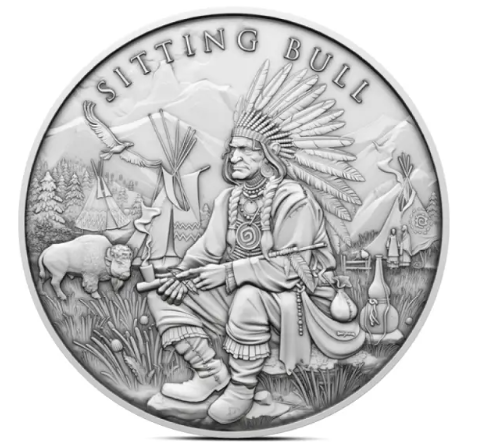 The Obverse Design The obverse side of the 1 oz Legendary Warriors: Sitting Bull Silver Round features the Hunkpapa Lakota leader, also known as Sitting Bull. This iconic depiction is heavily admired among historians and patriots. With Sitting Bull, the design also depicts the native American bull with the settlements in the background. The top of the round features the inscription “SITTING BULL.”