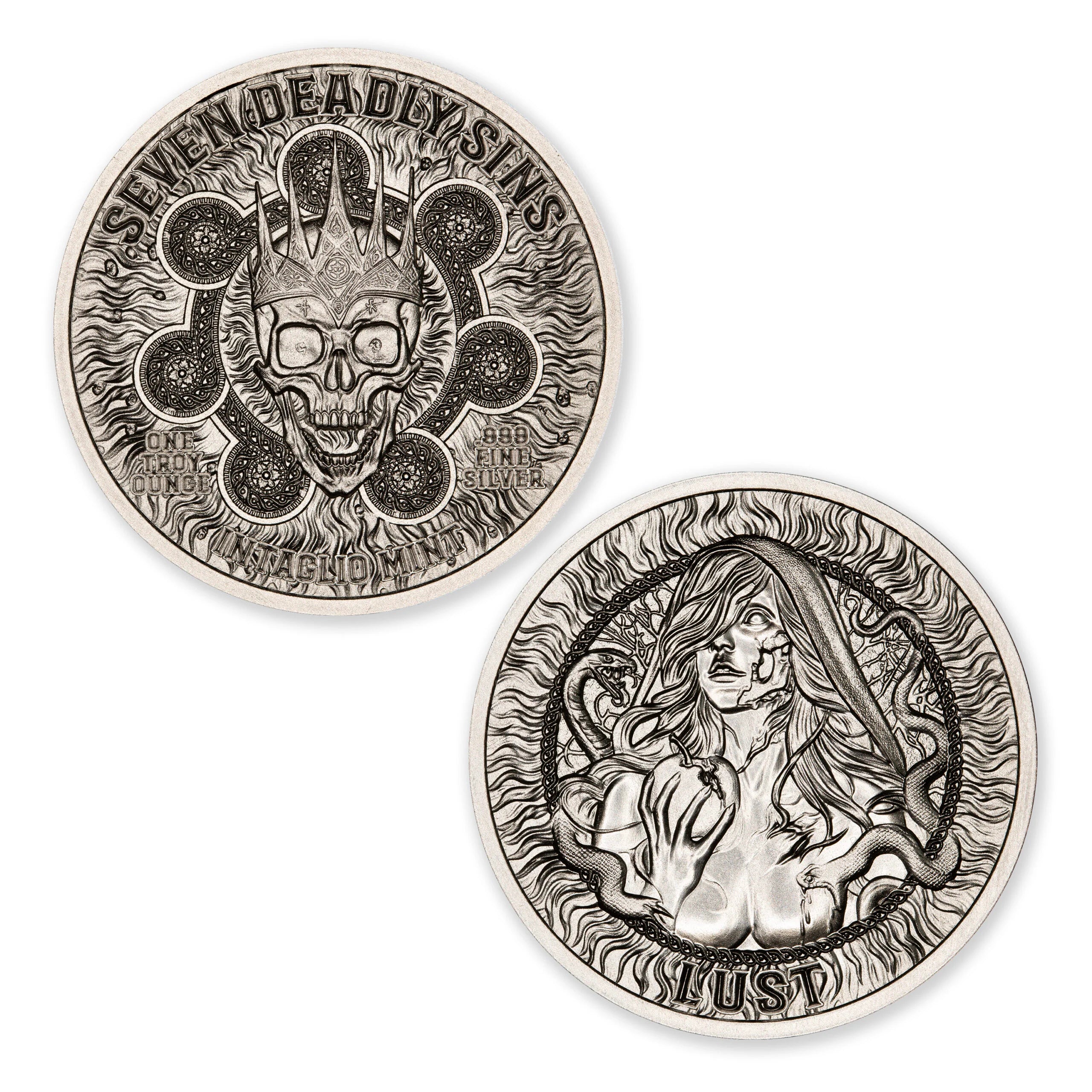 A glance. A touch. A hunger that knows no bounds. Lust, the newest installment in the Seven Deadly Sins Series, embodies the dangerous allure of unchecked desire. The obverse depicts a striking female figure entwined with serpents, her eyes aflame with longing and temptation. Flames and flowing hair swirl into the border, capturing the heat and volatility of passion that consumes all in its path.